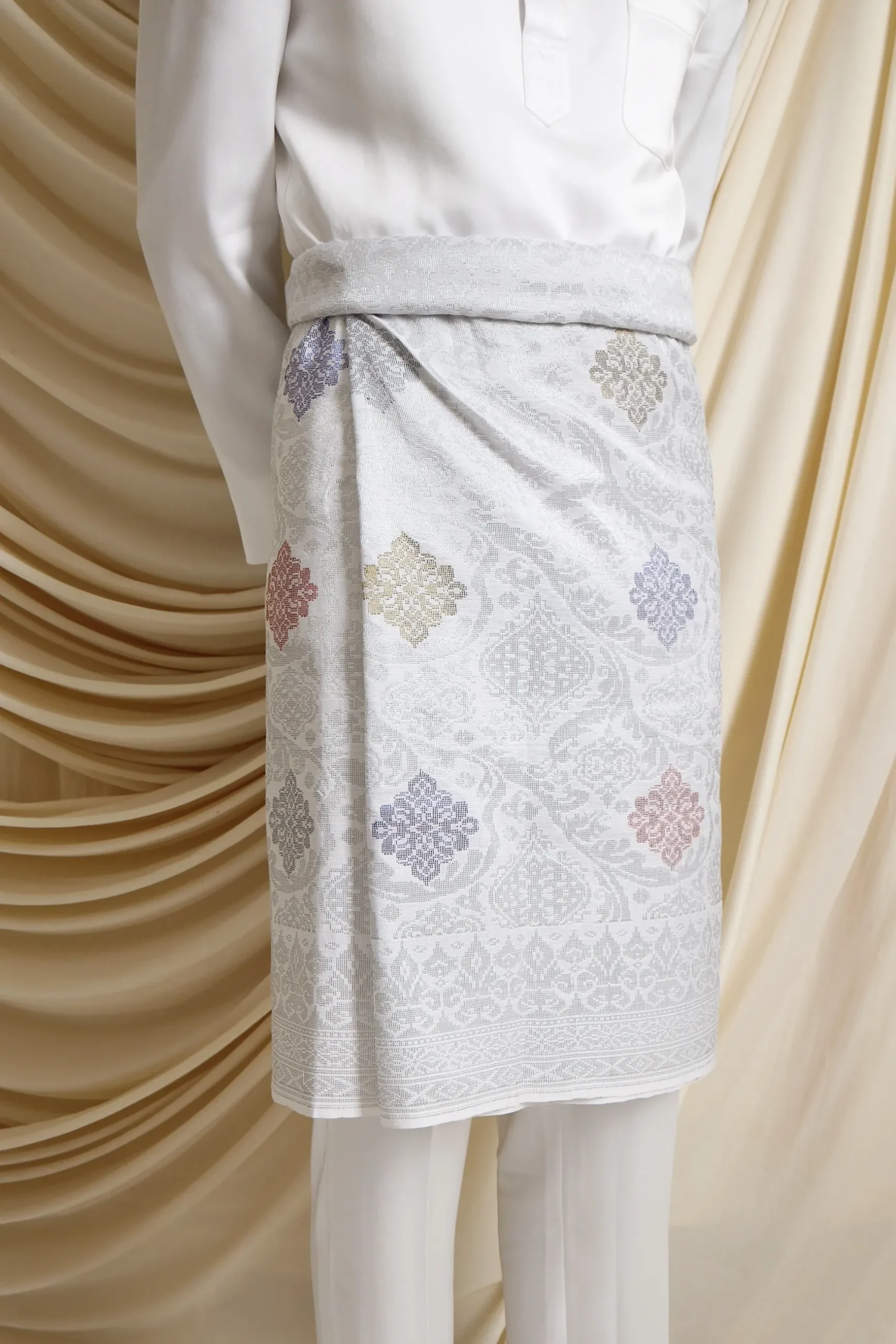 A timeless silver songket, exuding grace and sophistication. Perfect for brides seeking a classic and regal look.