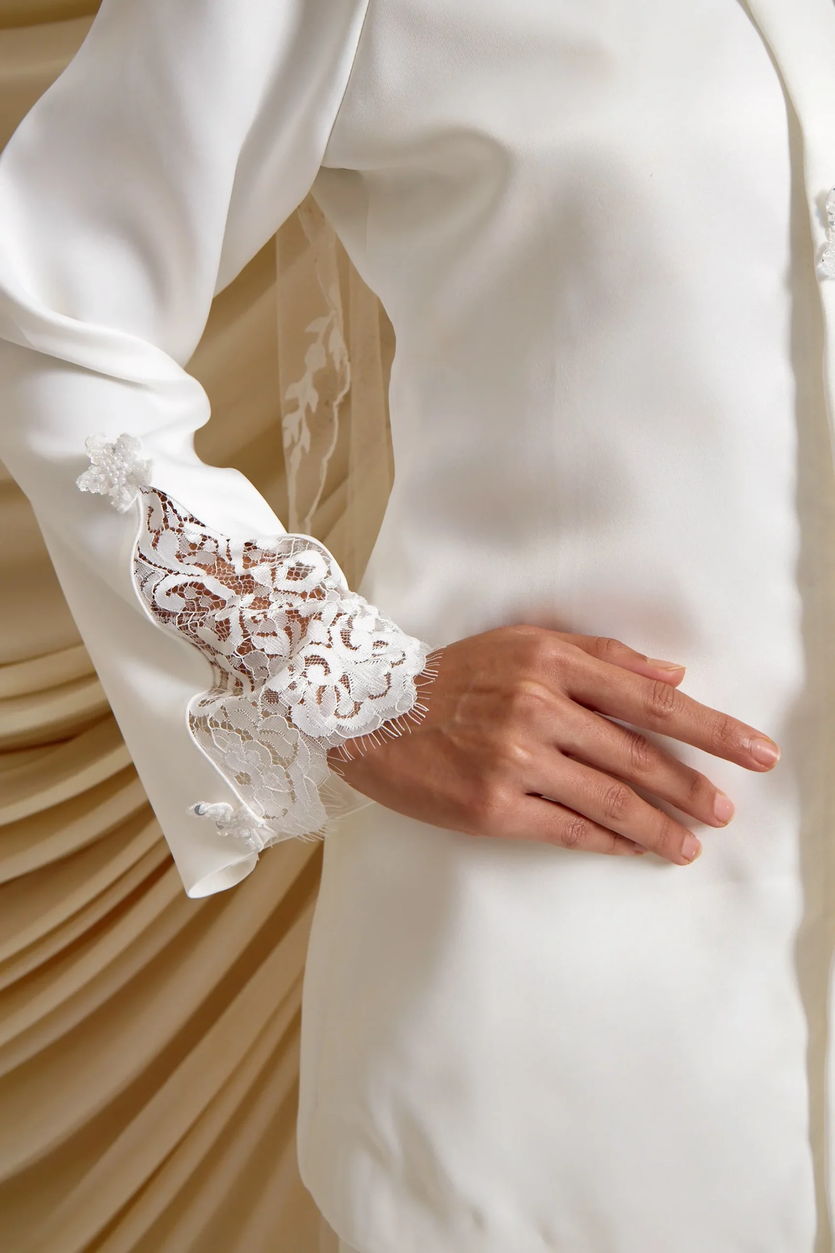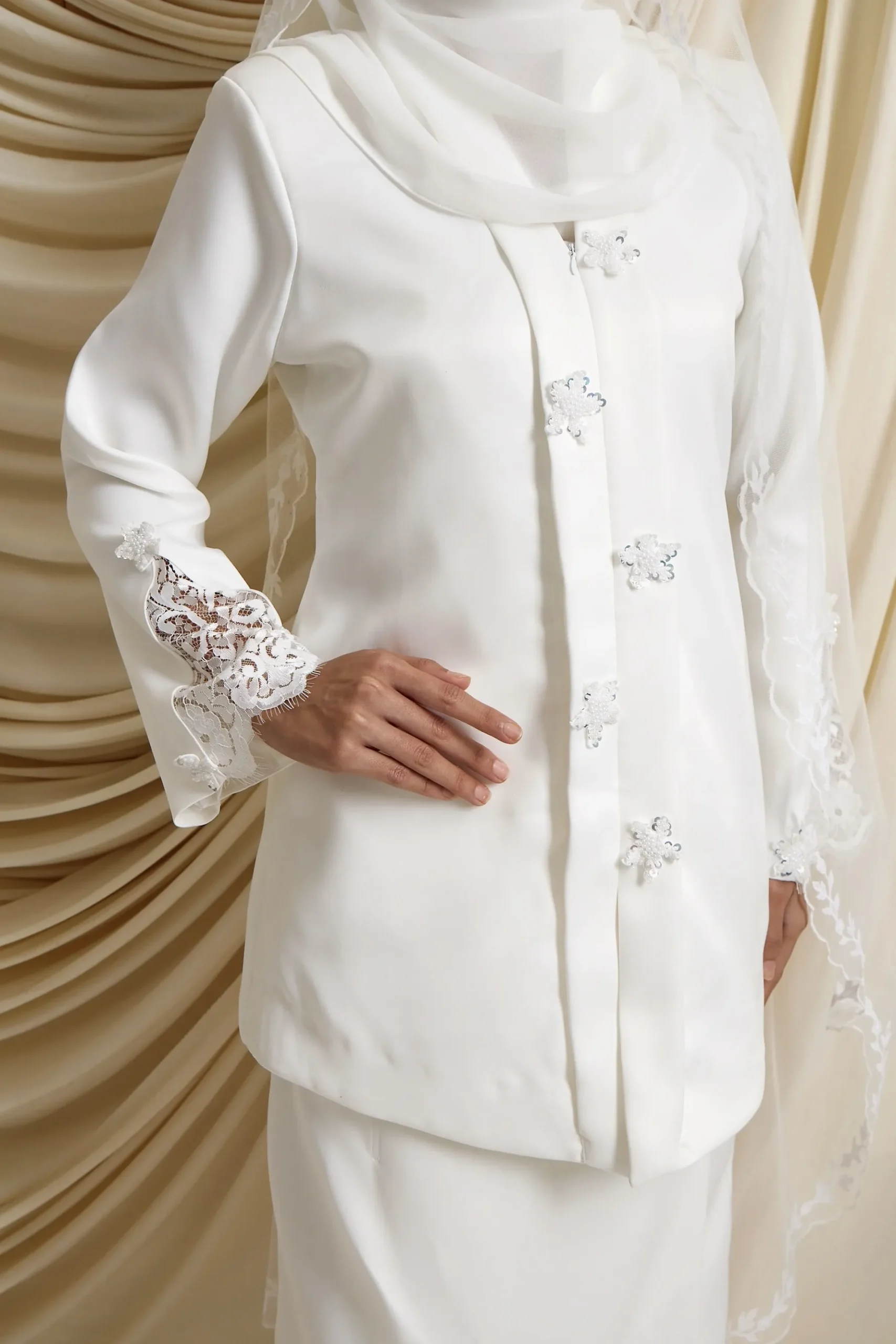 Modern Kebaya with French lace, flower buttons and embroidery in off white.