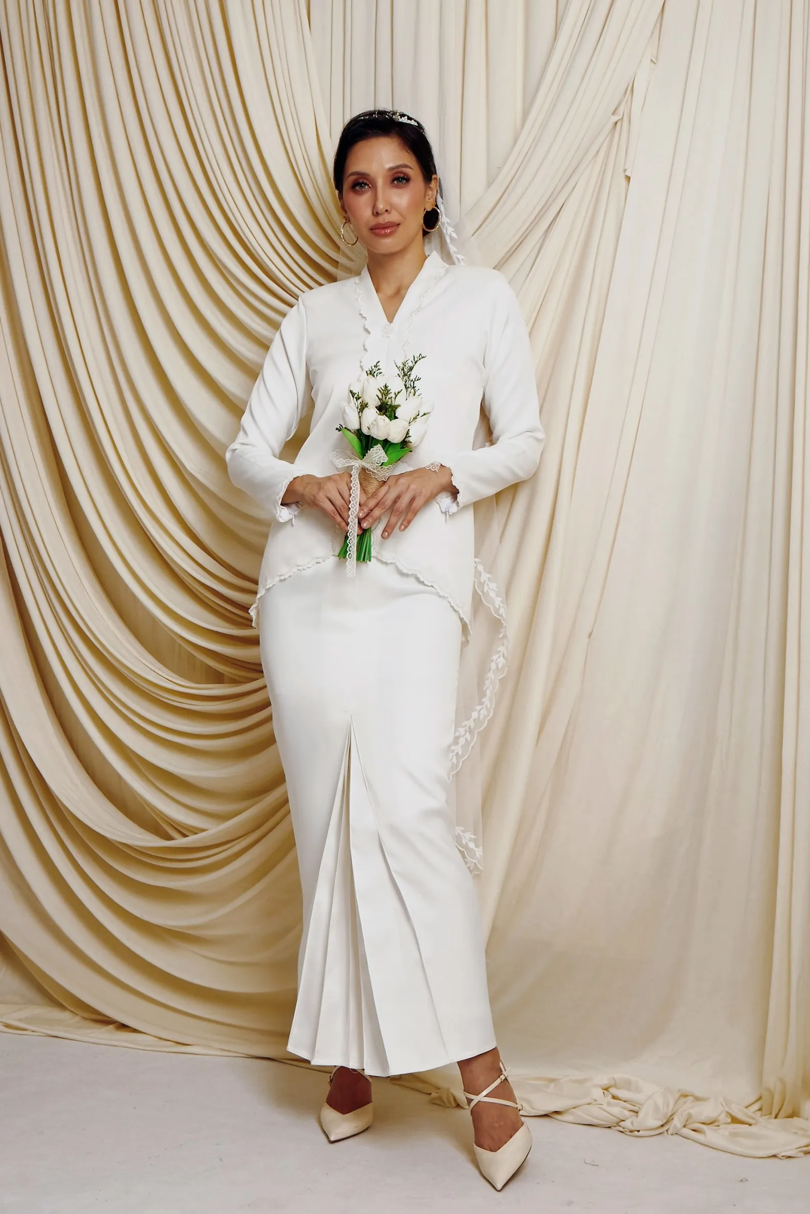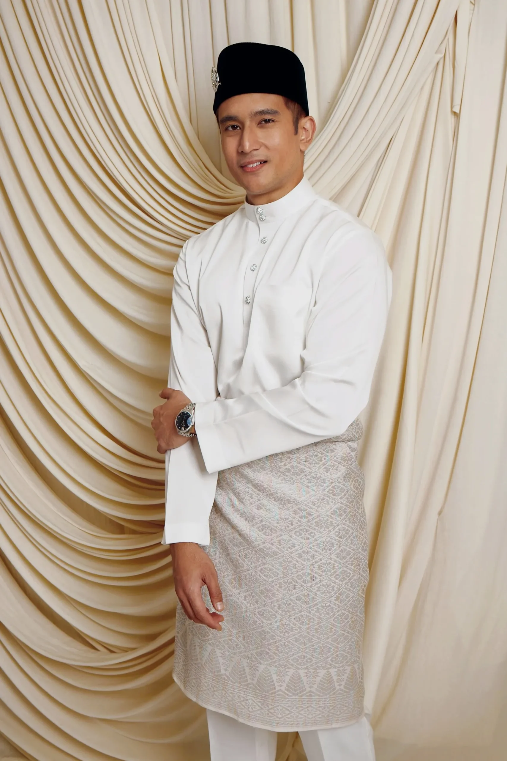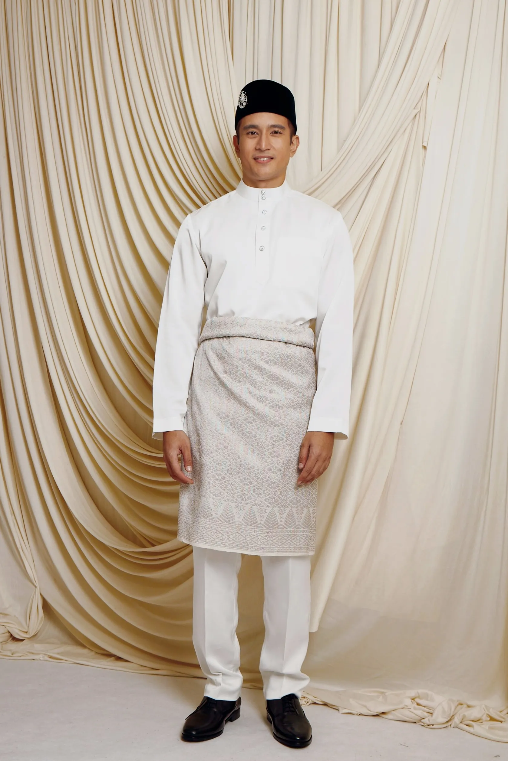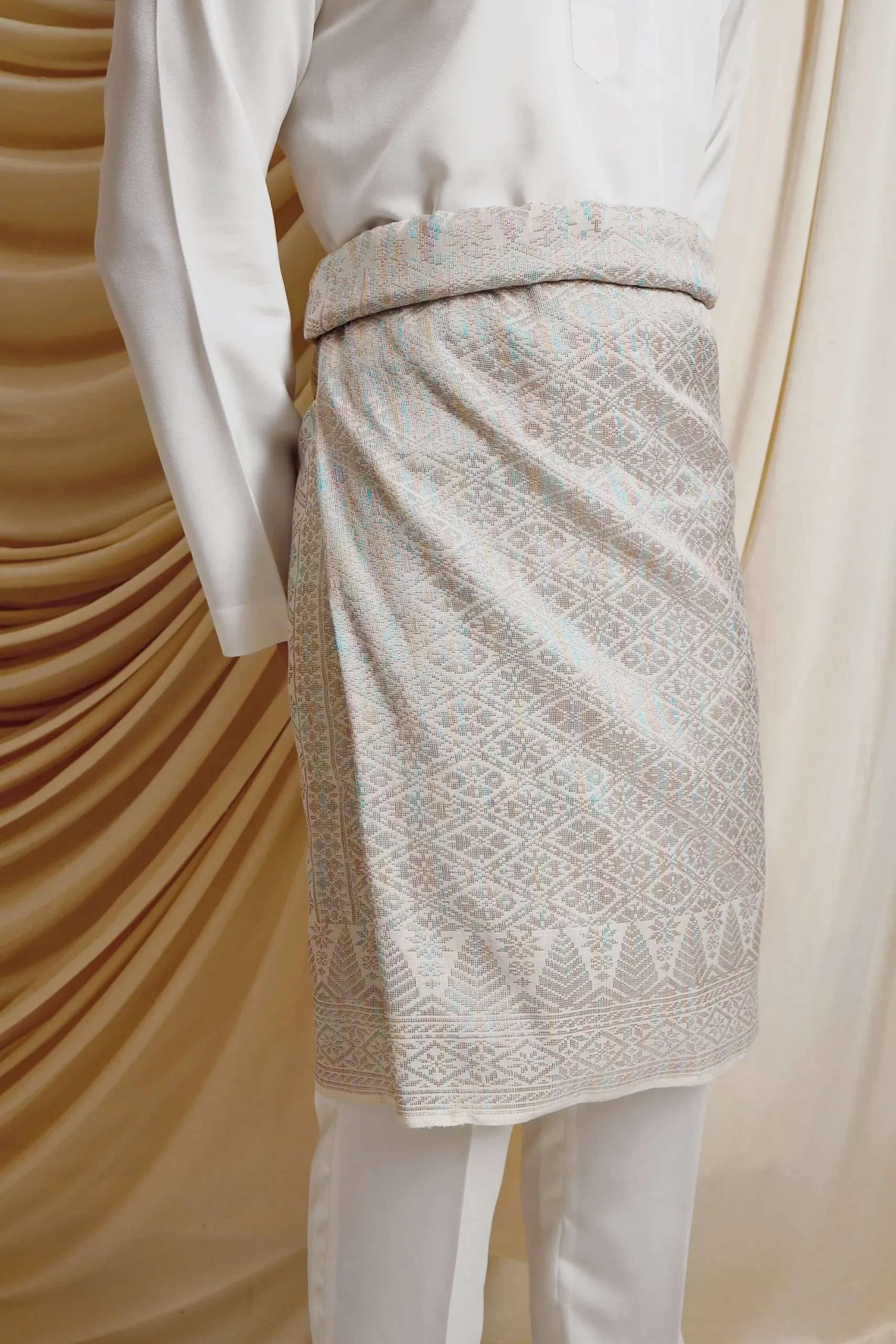 A timeless silver songket, exuding grace and sophistication. Perfect for brides seeking a classic and regal look.