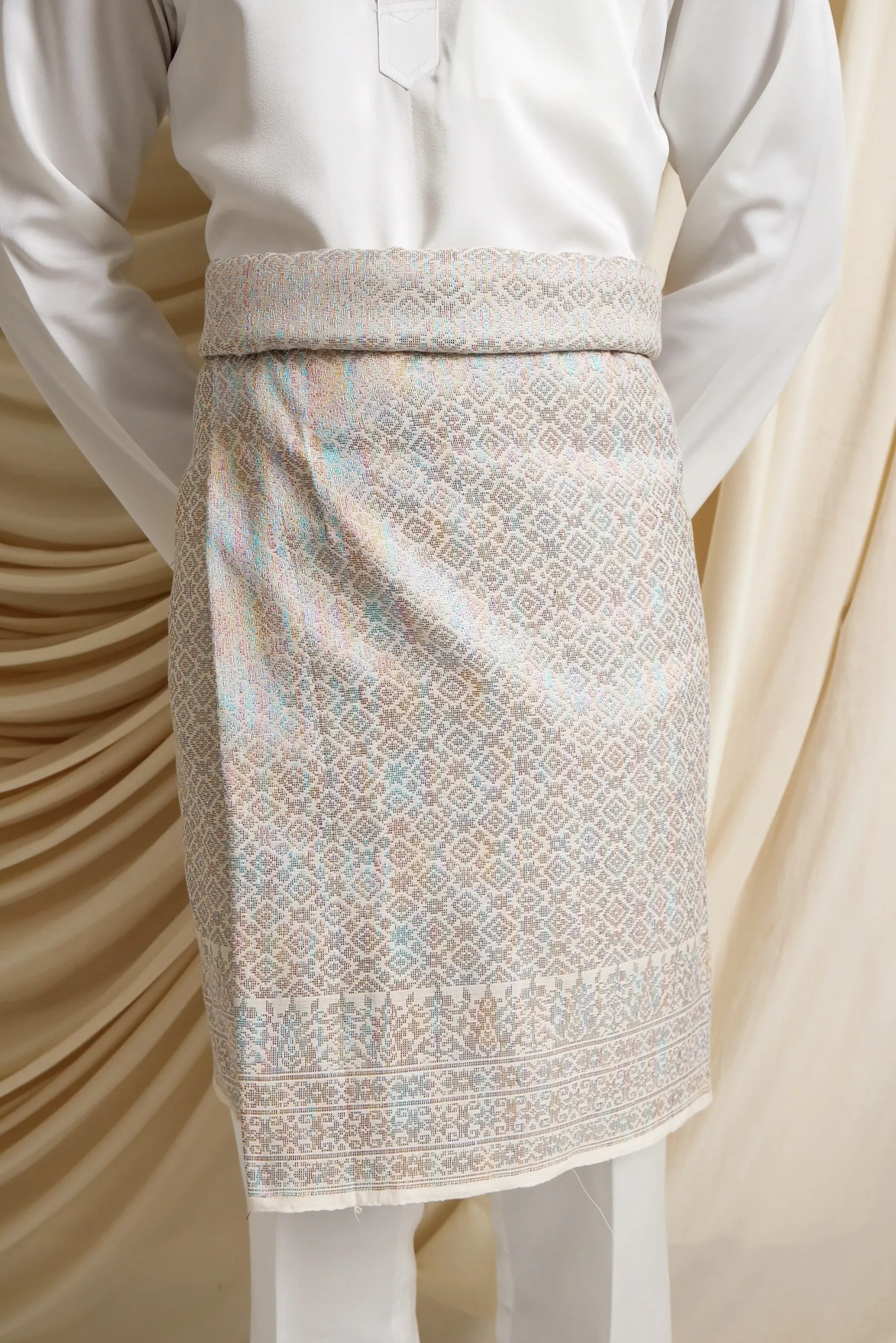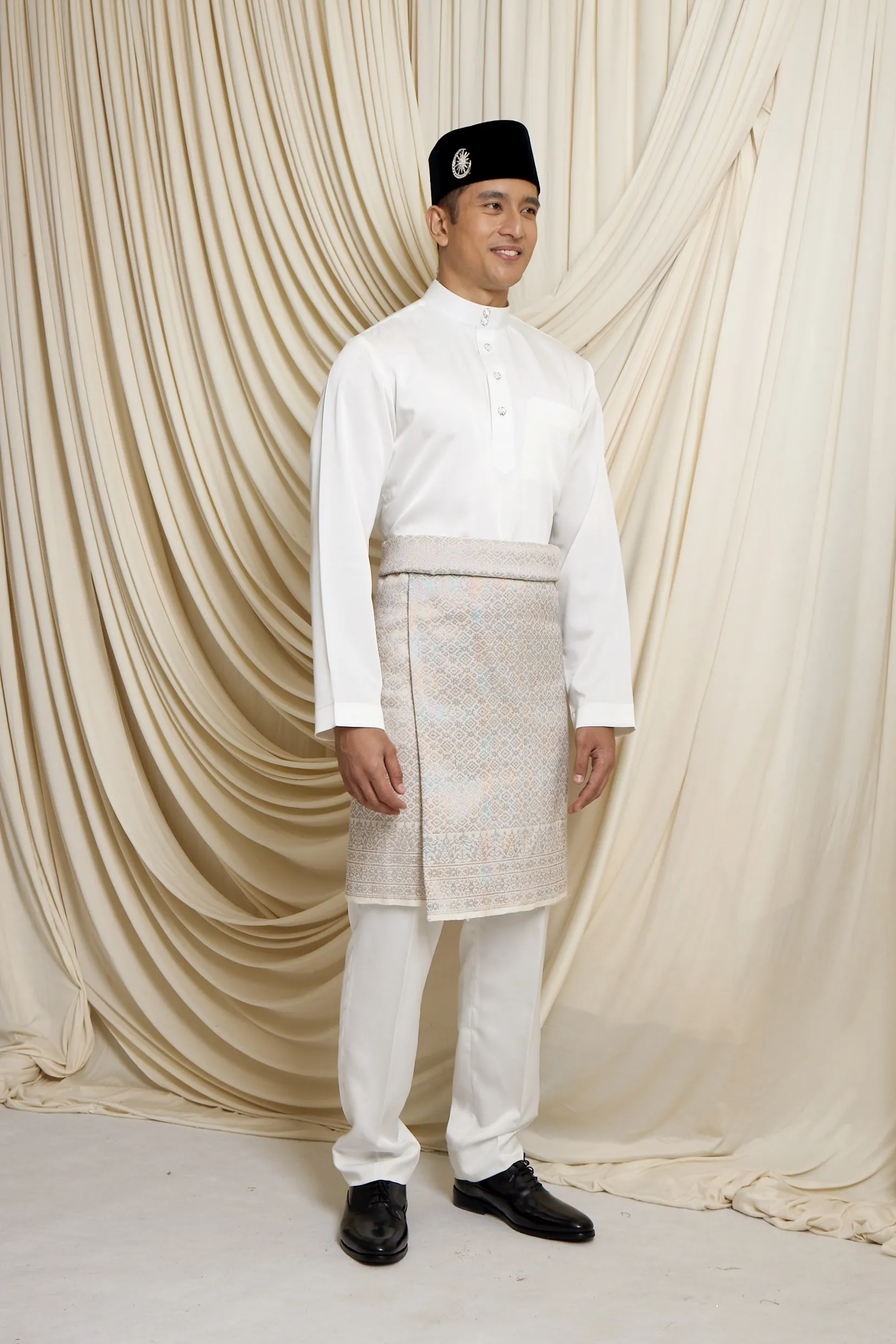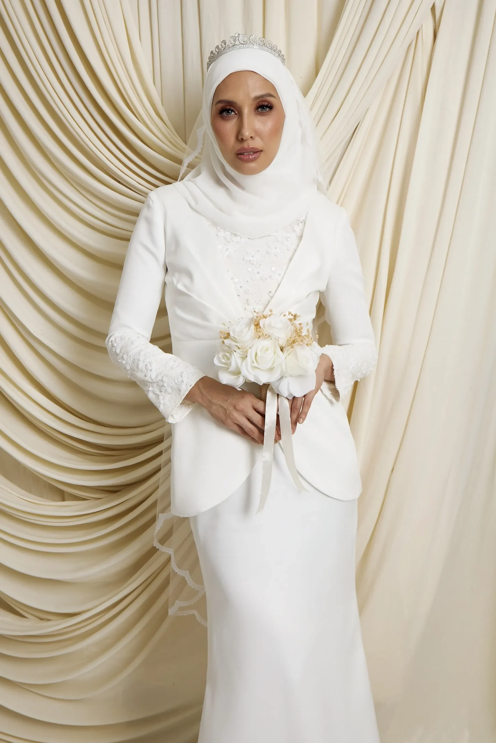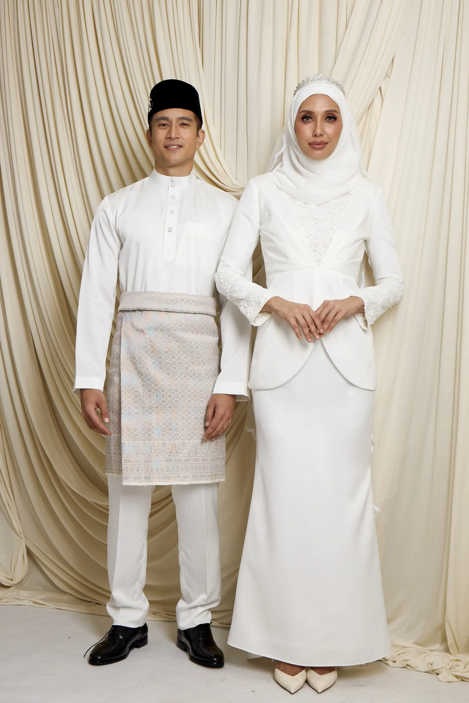 A timeless silver songket, exuding grace and sophistication. Perfect for brides seeking a classic and regal look.