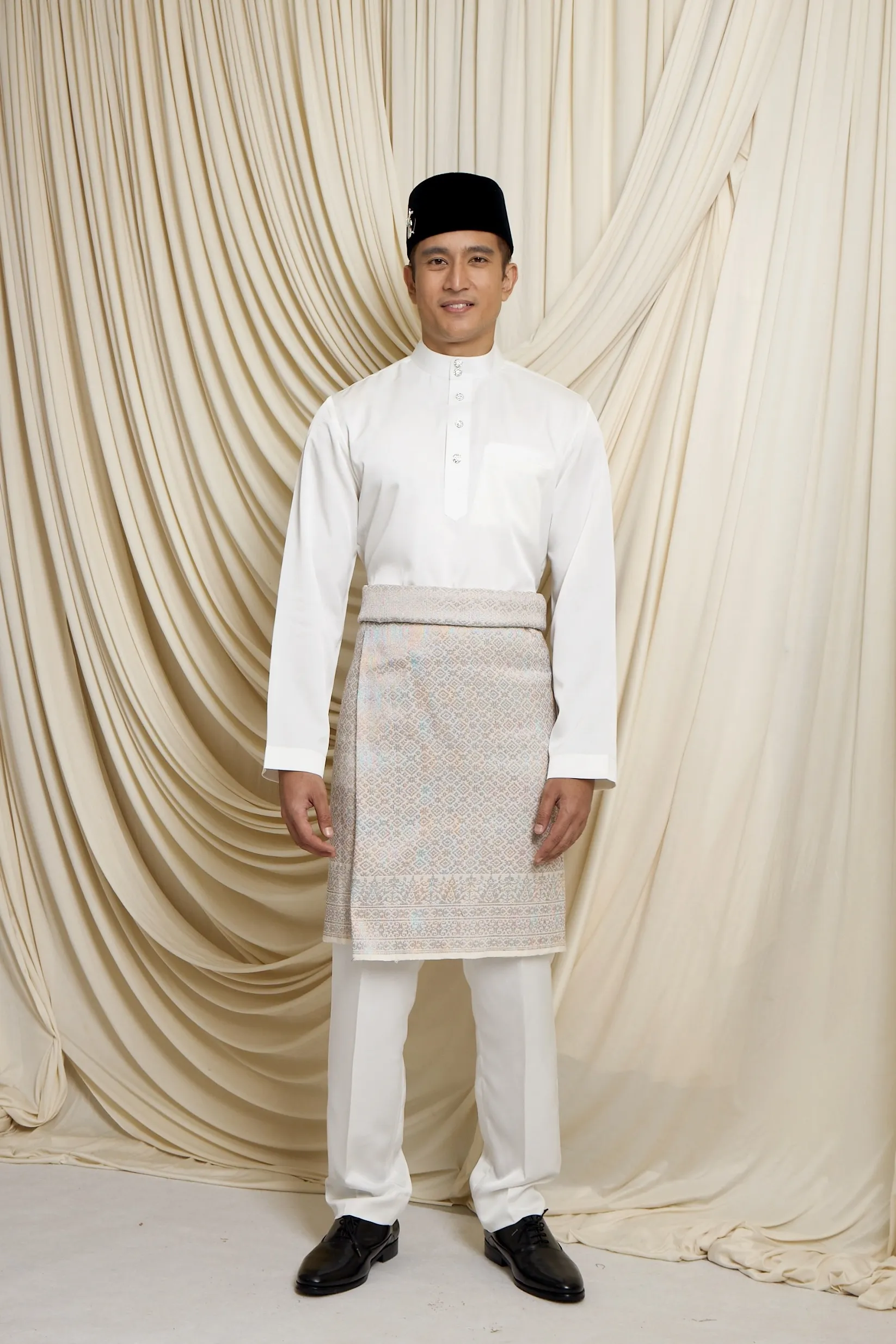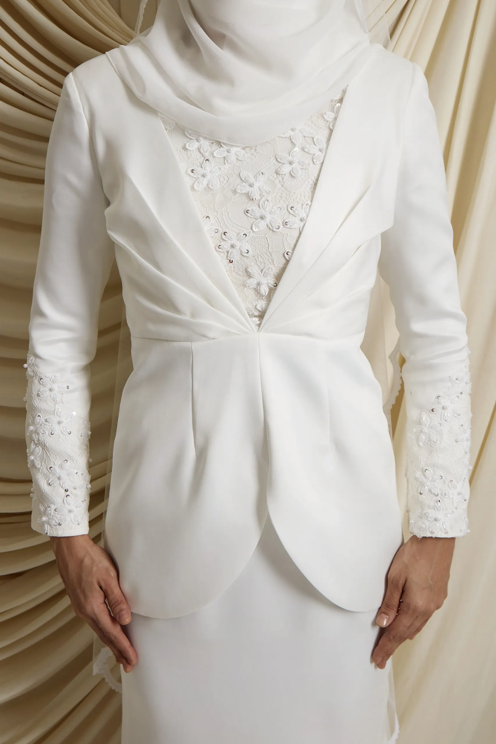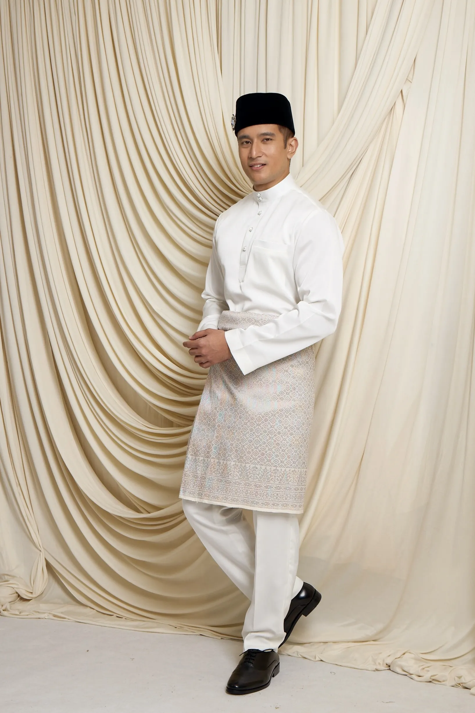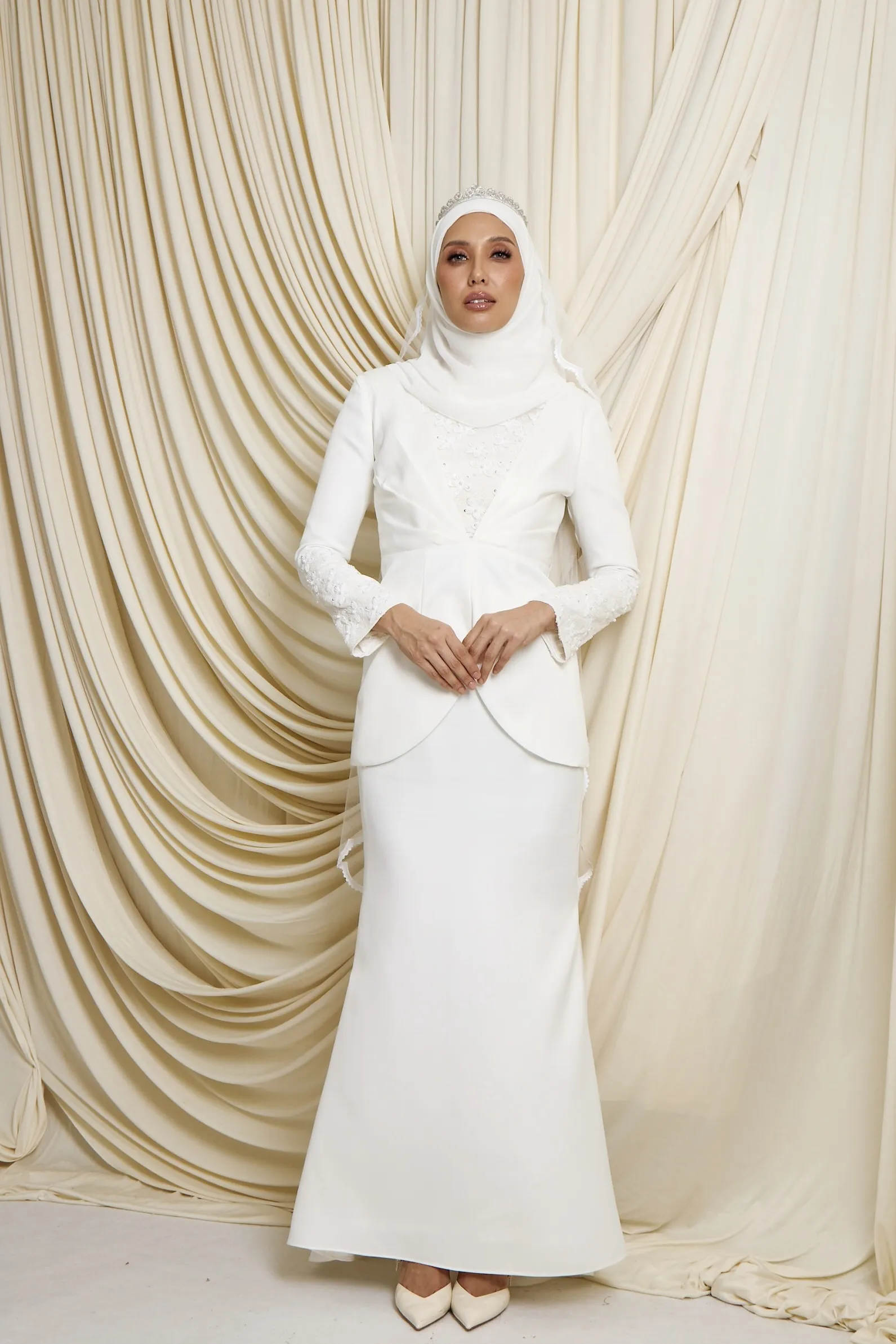 A timeless silver songket, exuding grace and sophistication. Perfect for brides seeking a classic and regal look.