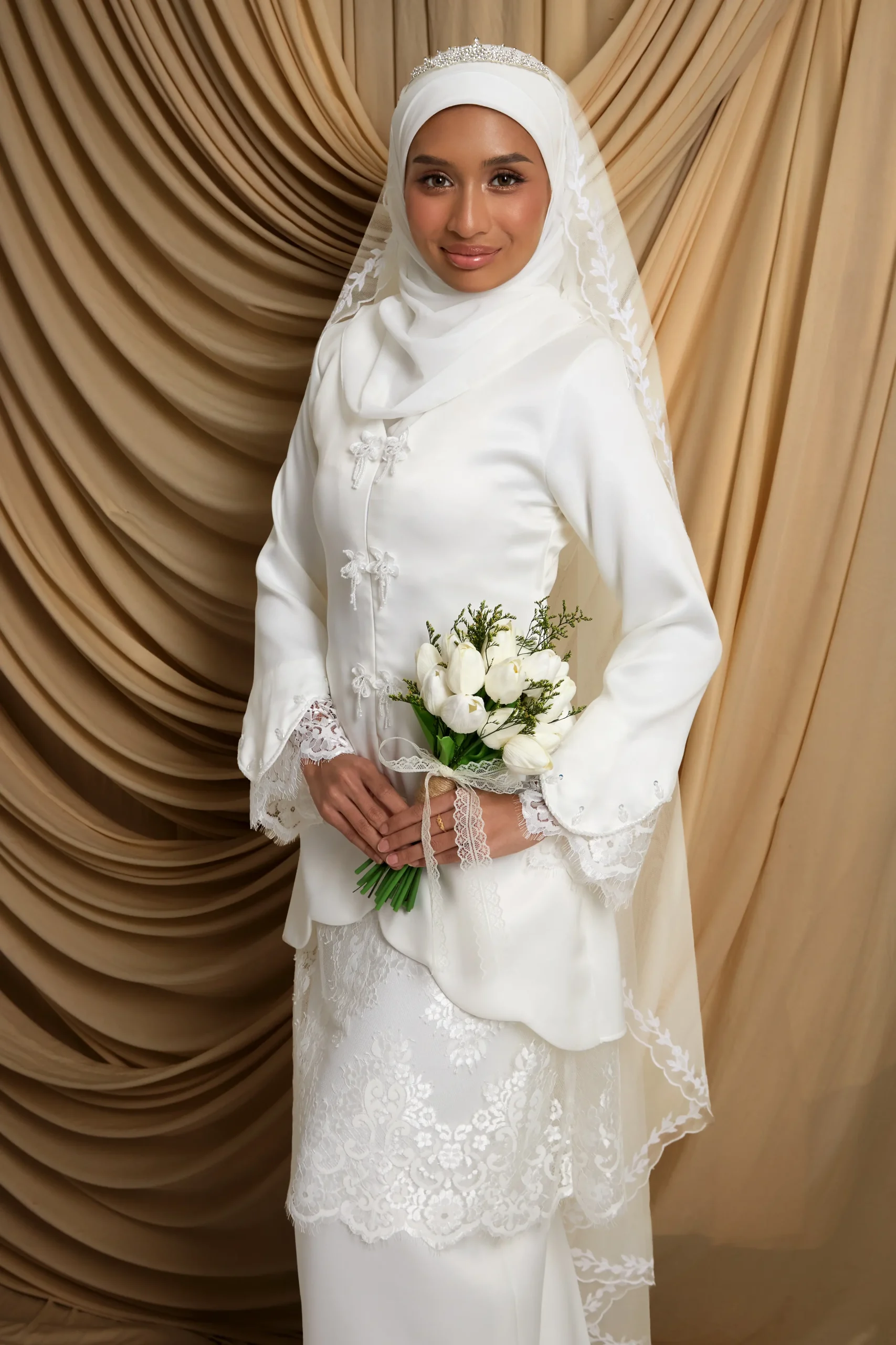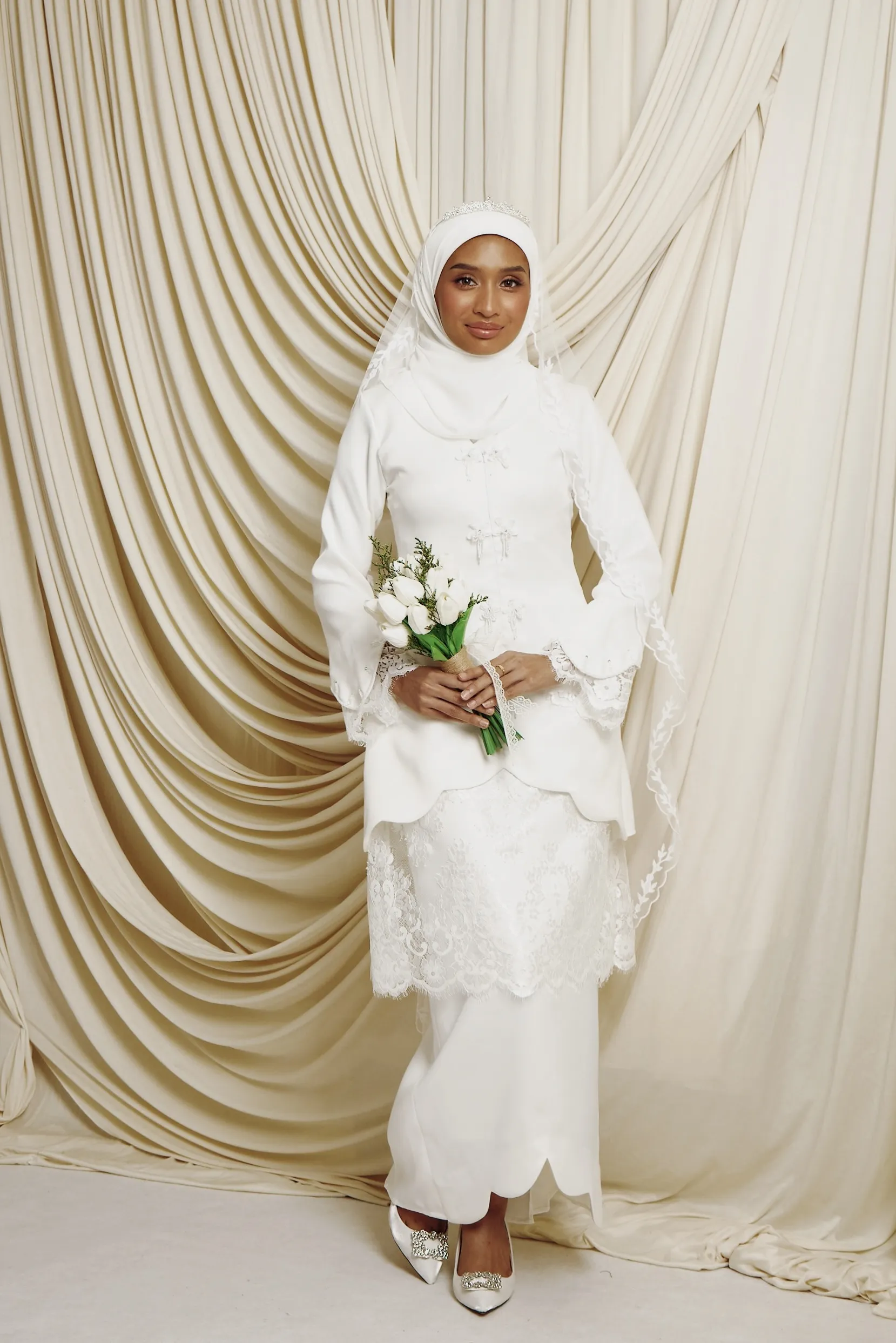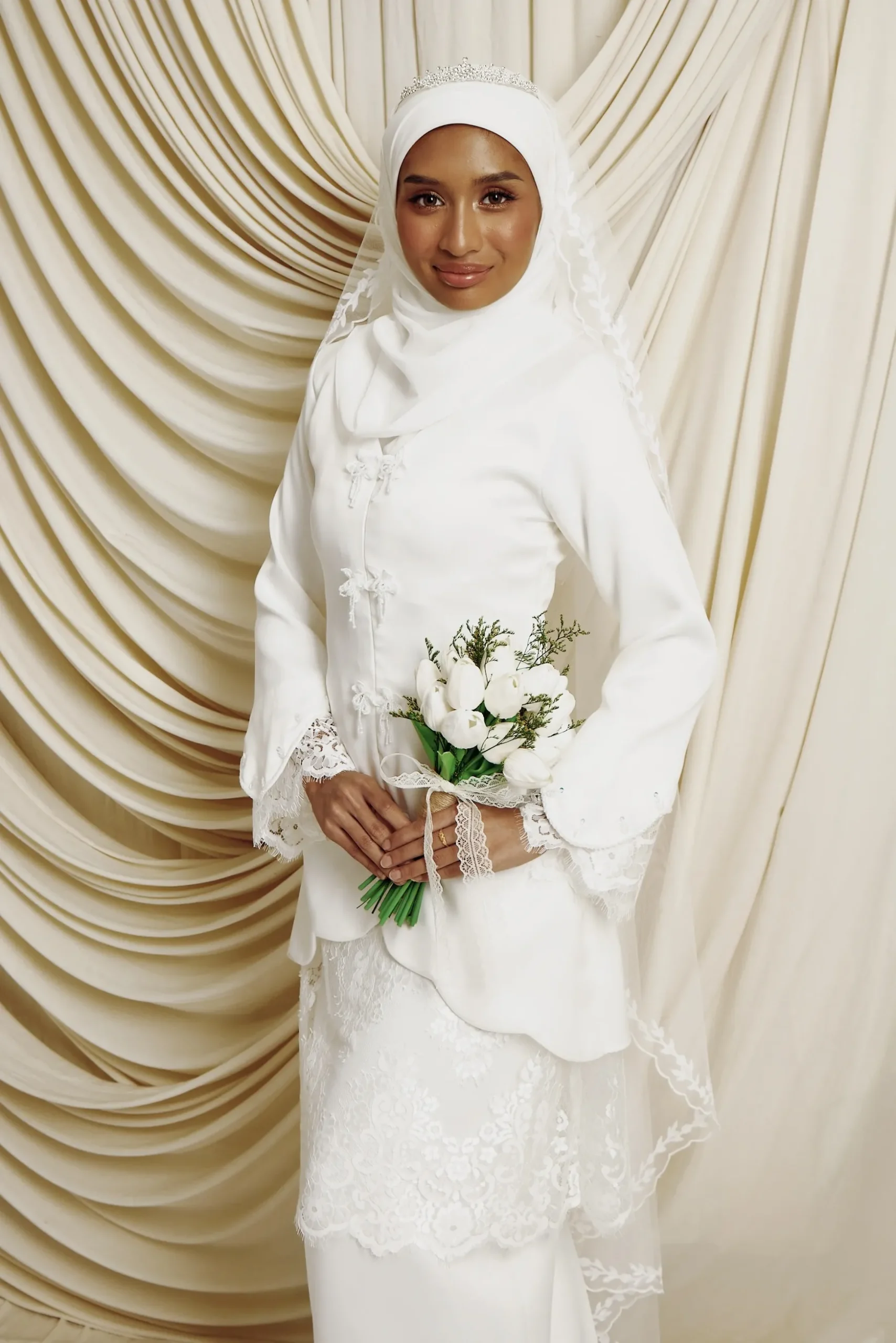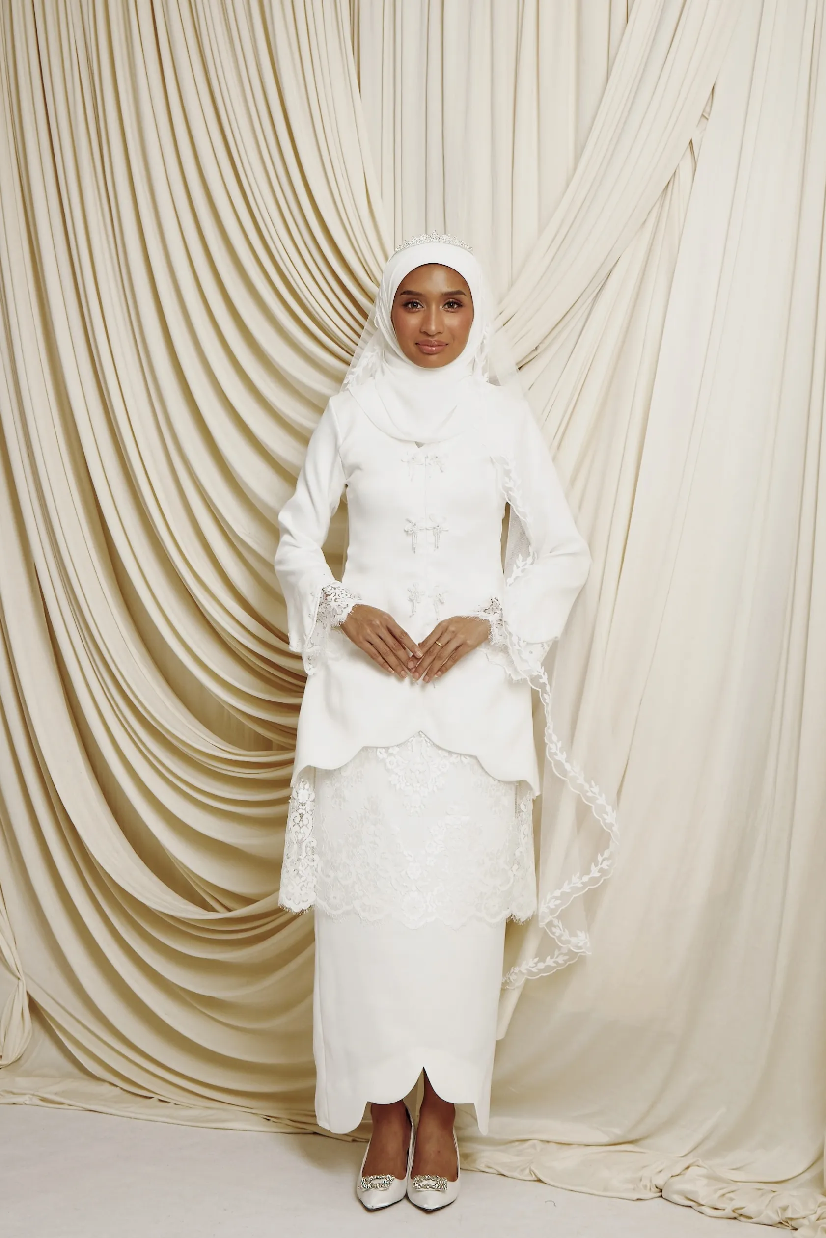 Modern Kebaya with French lace, scallops, flower buttons and embroidery in off white.