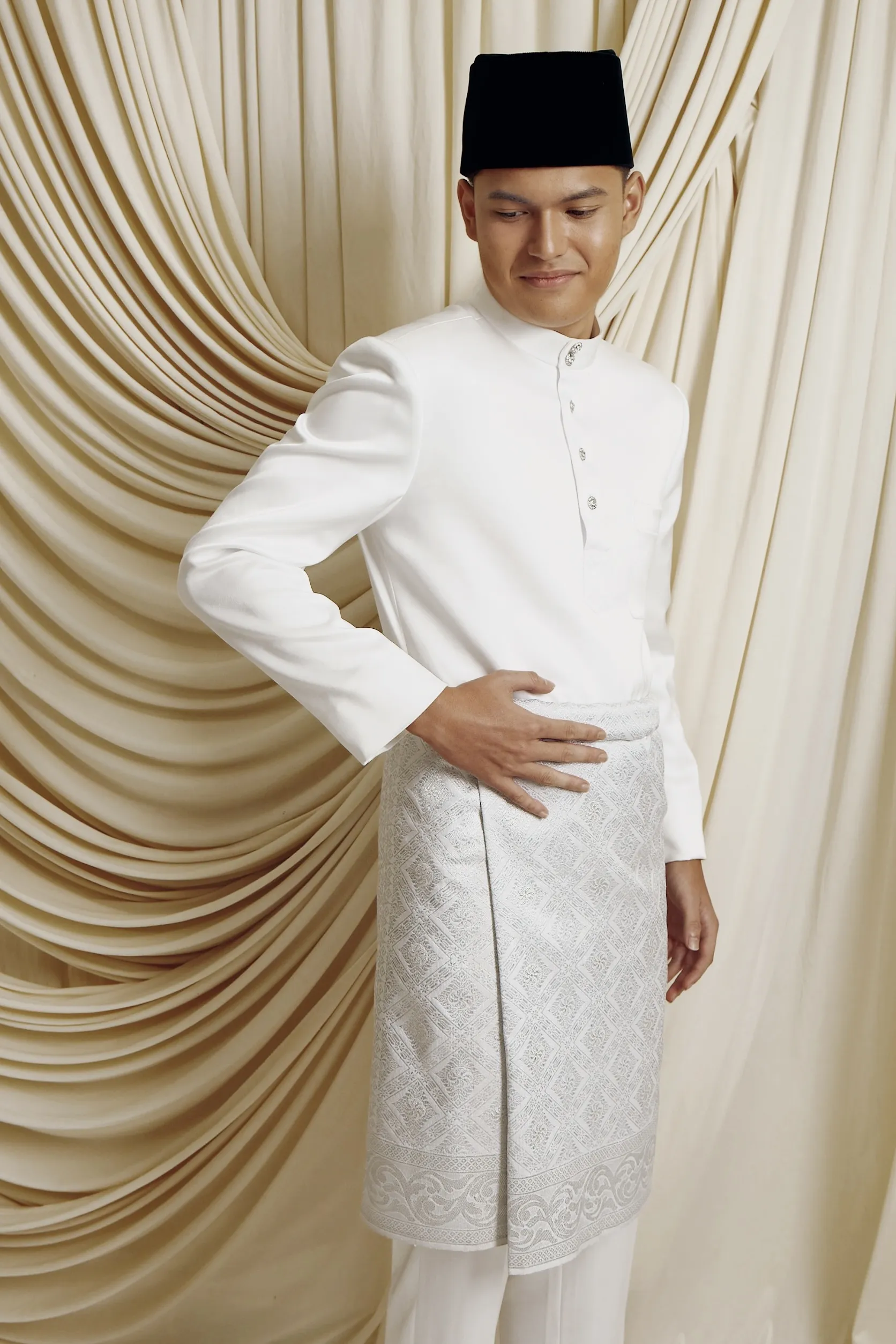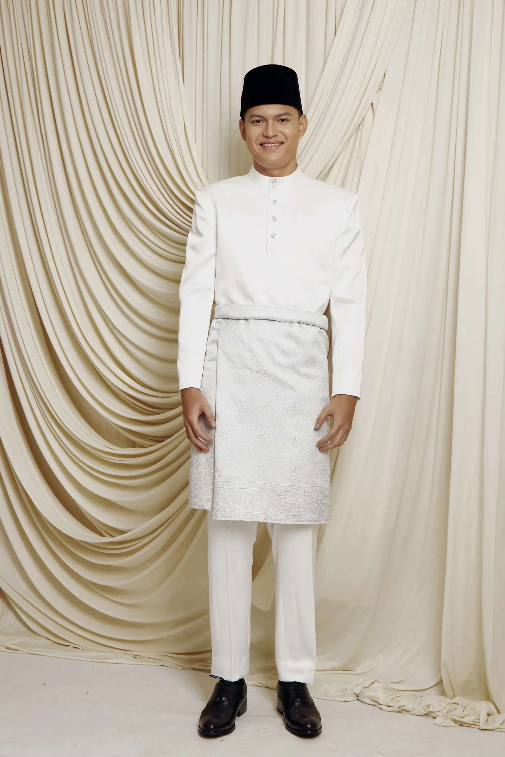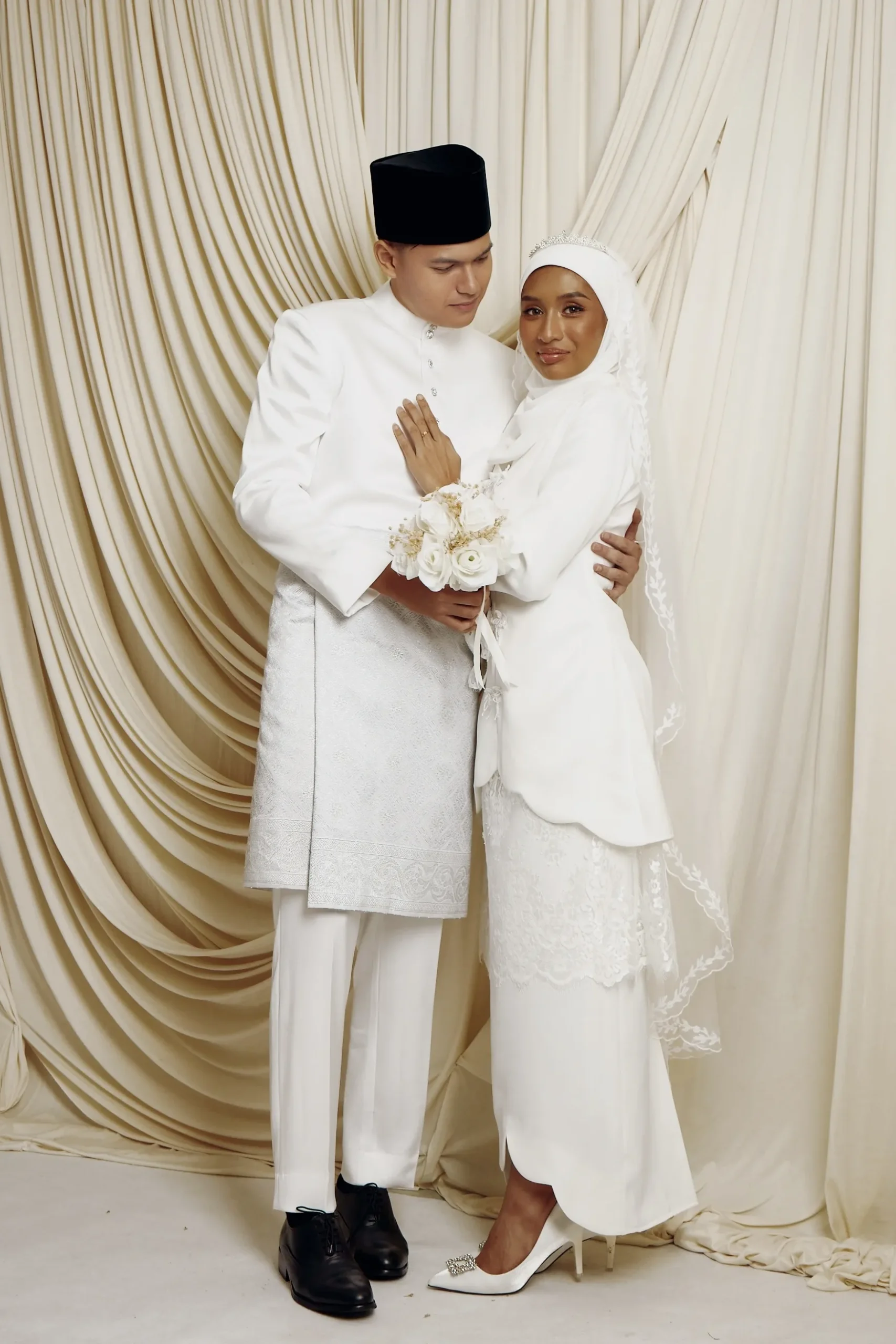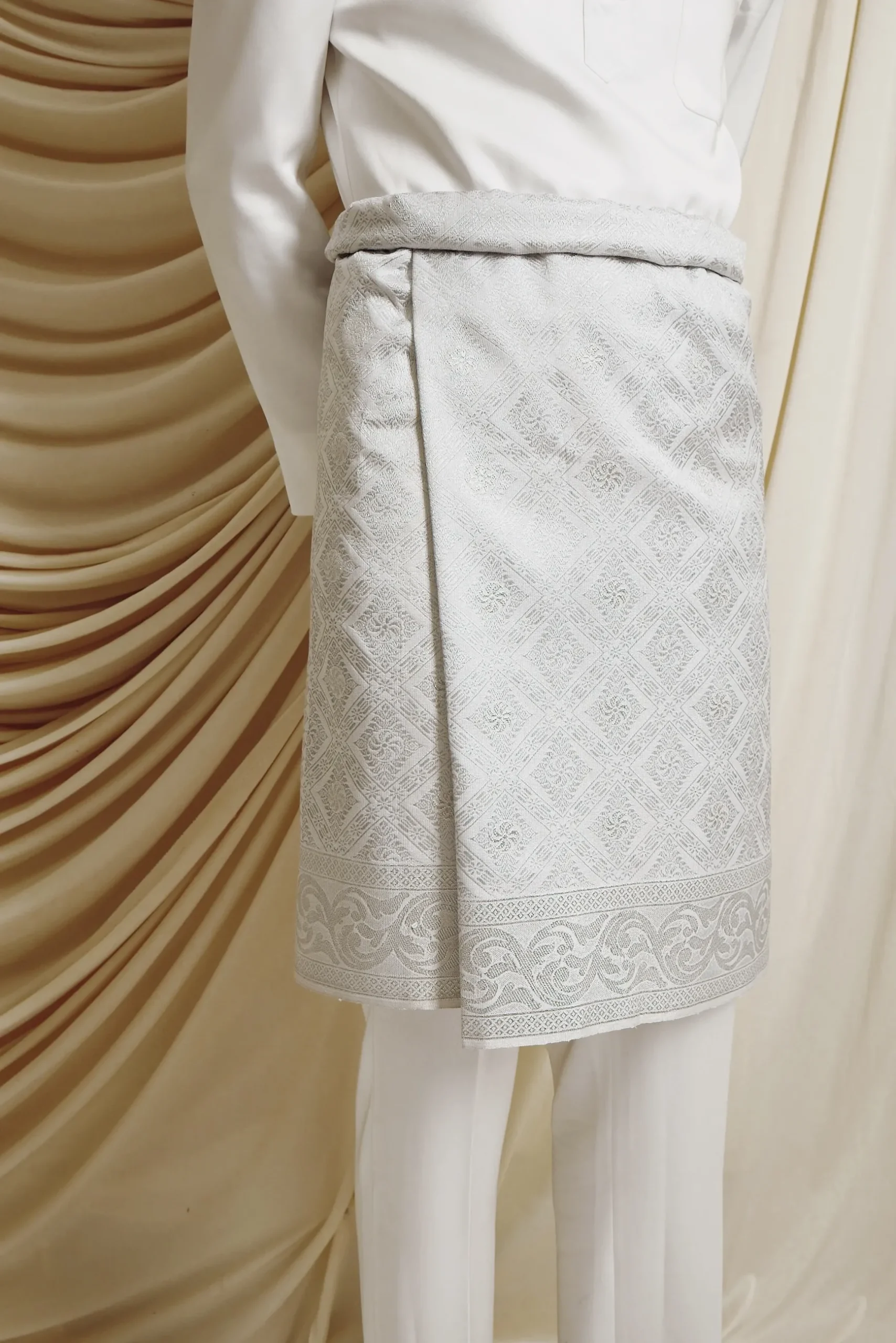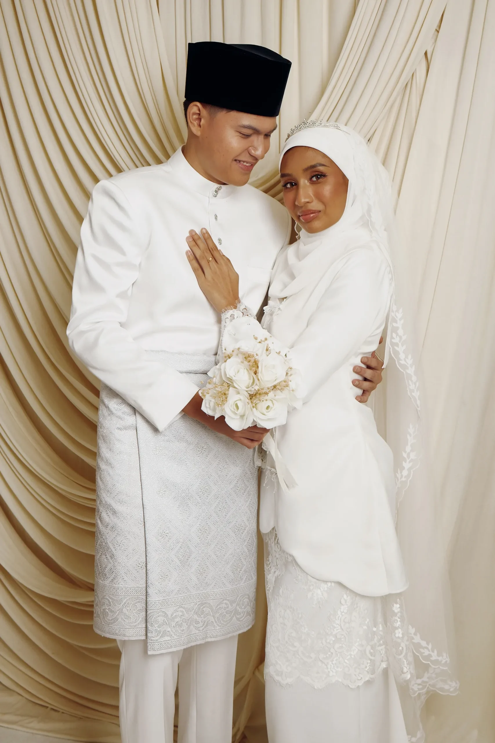 A timeless silver songket, exuding grace and sophistication. Perfect for brides seeking a classic and regal look.