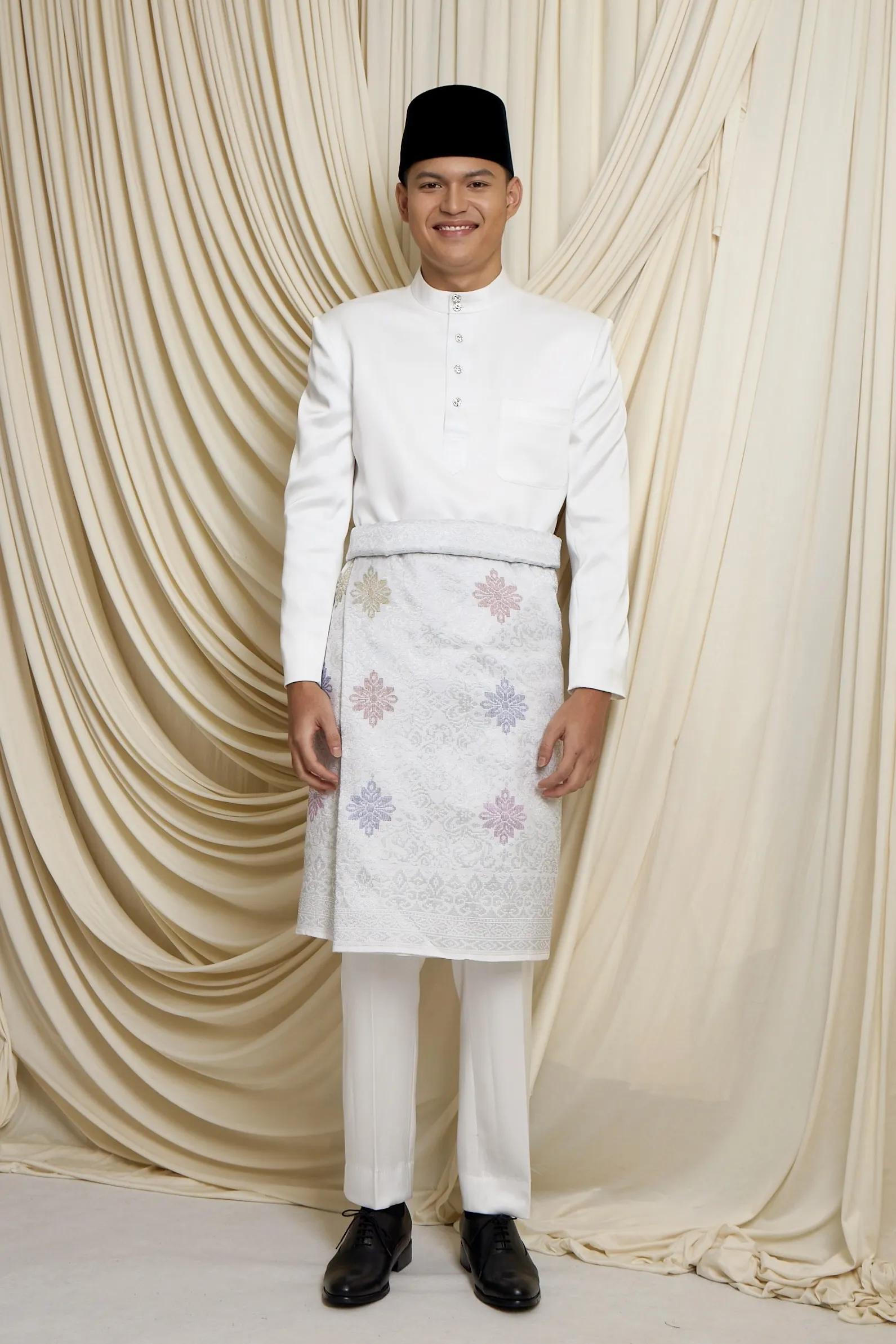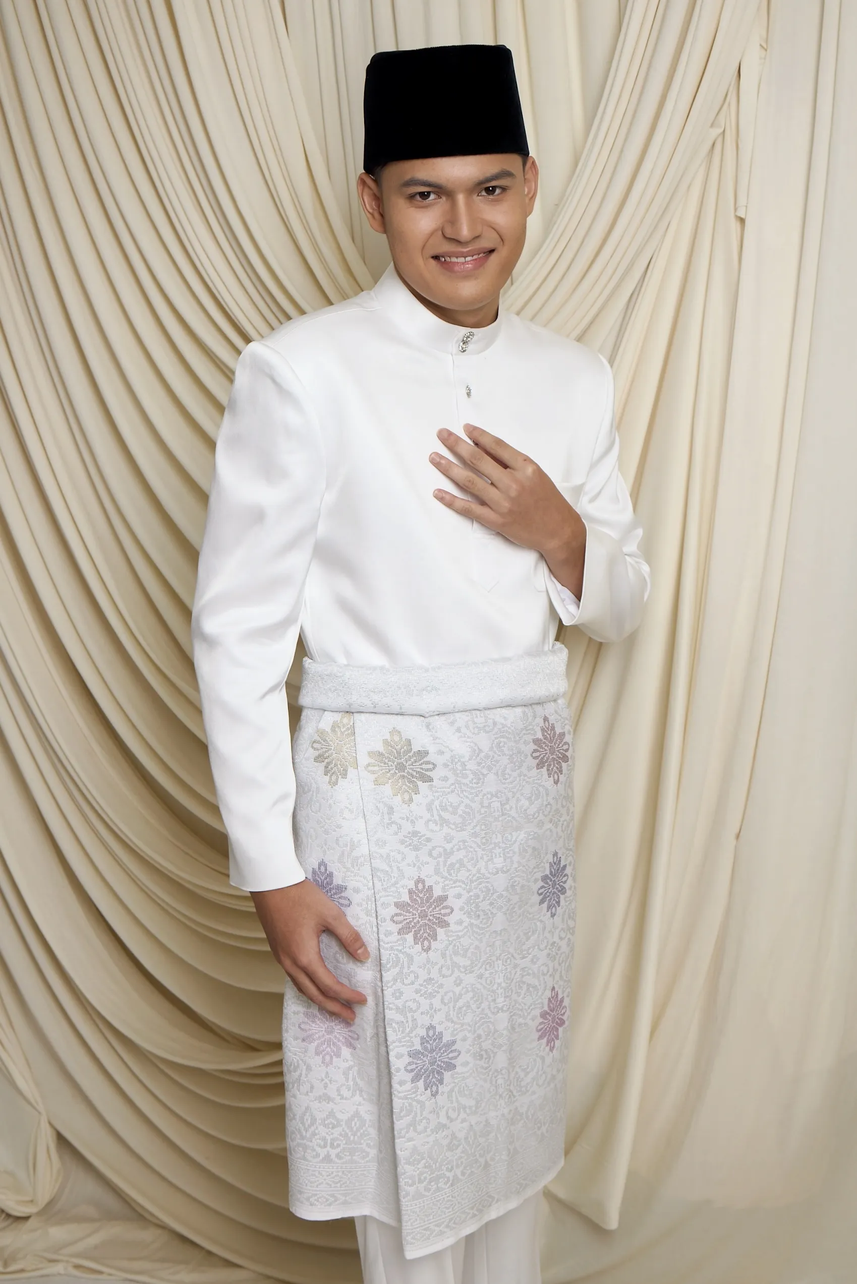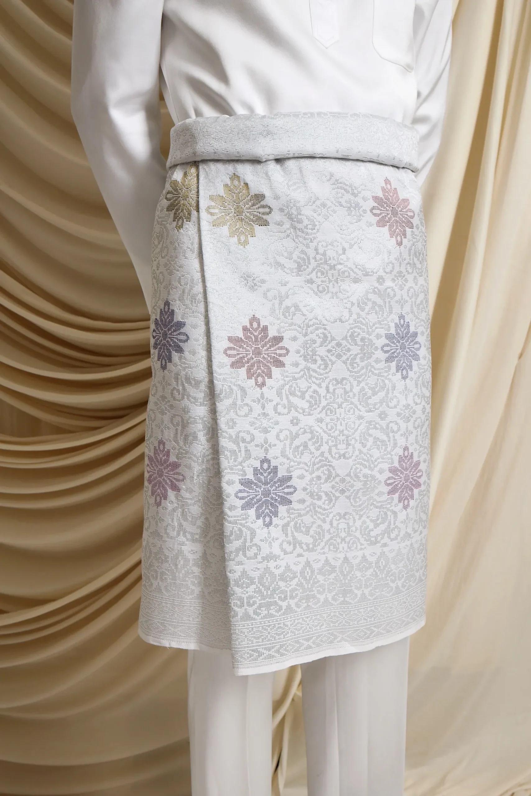• Intricately woven songket fabric in silver tones