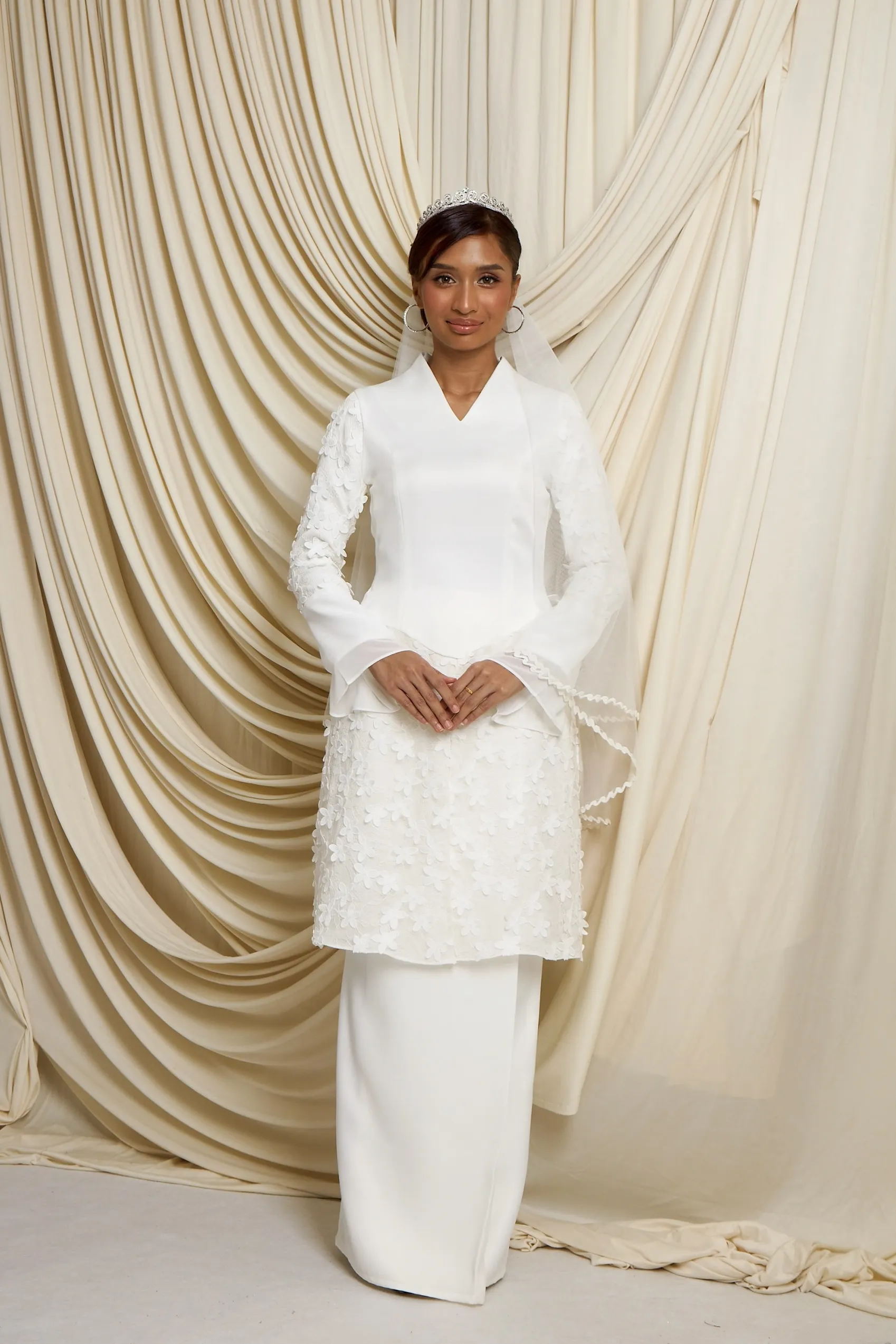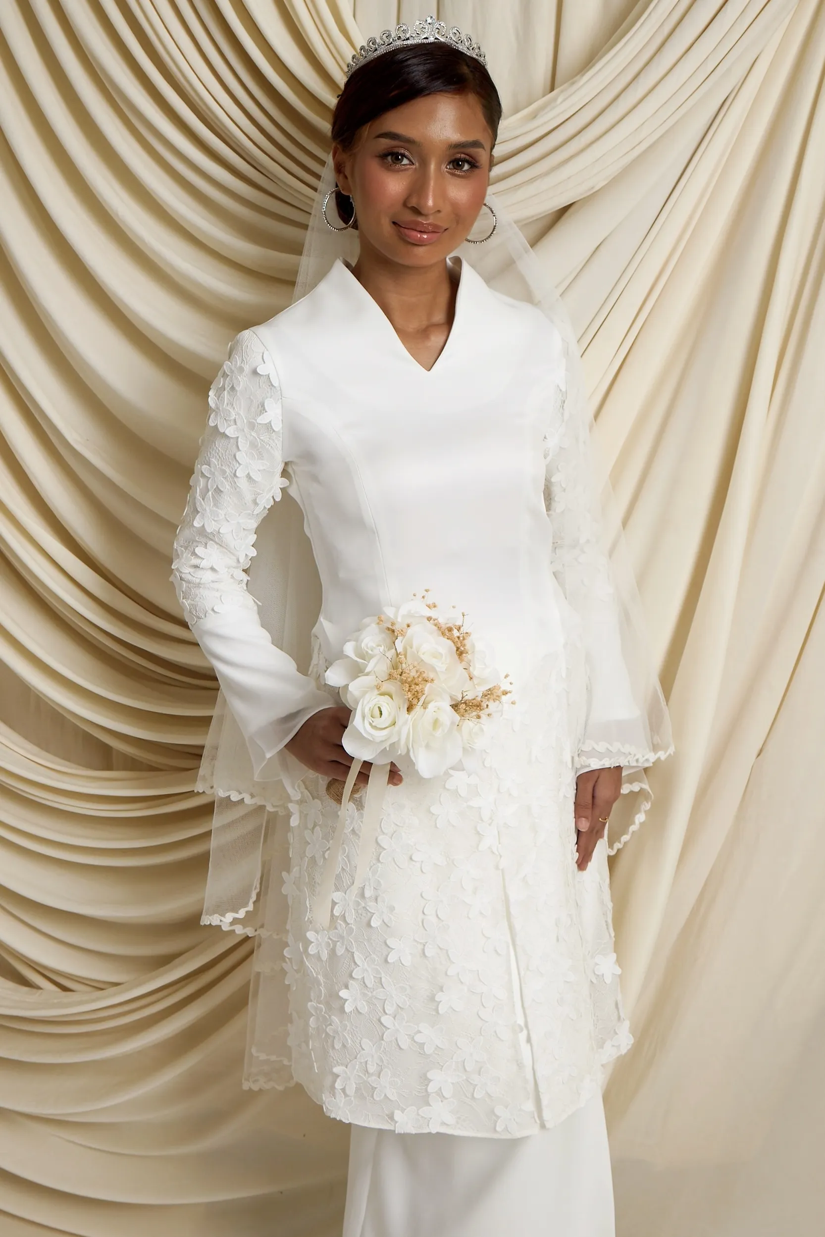 Long Kebaya with 3d floral lace in off white.