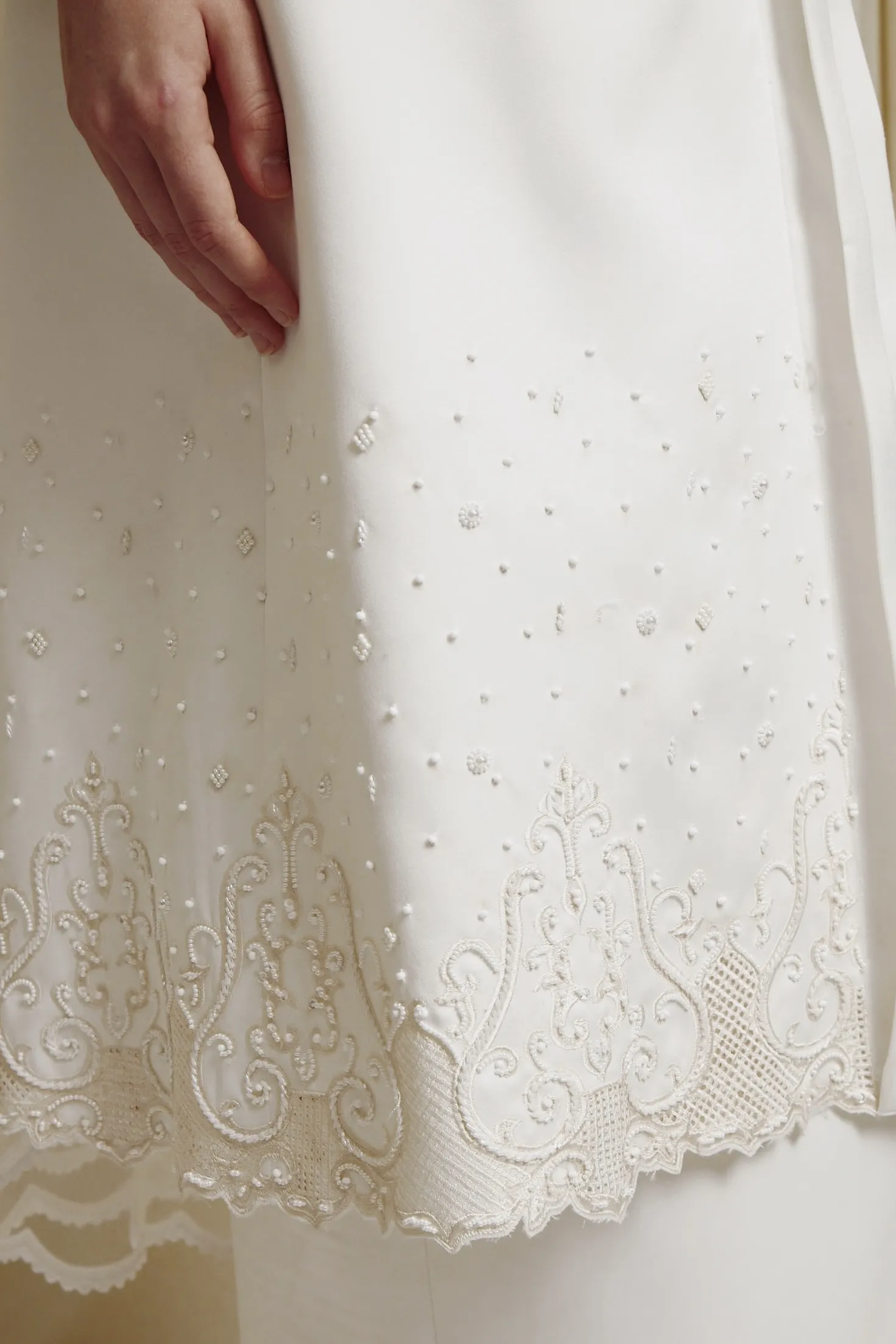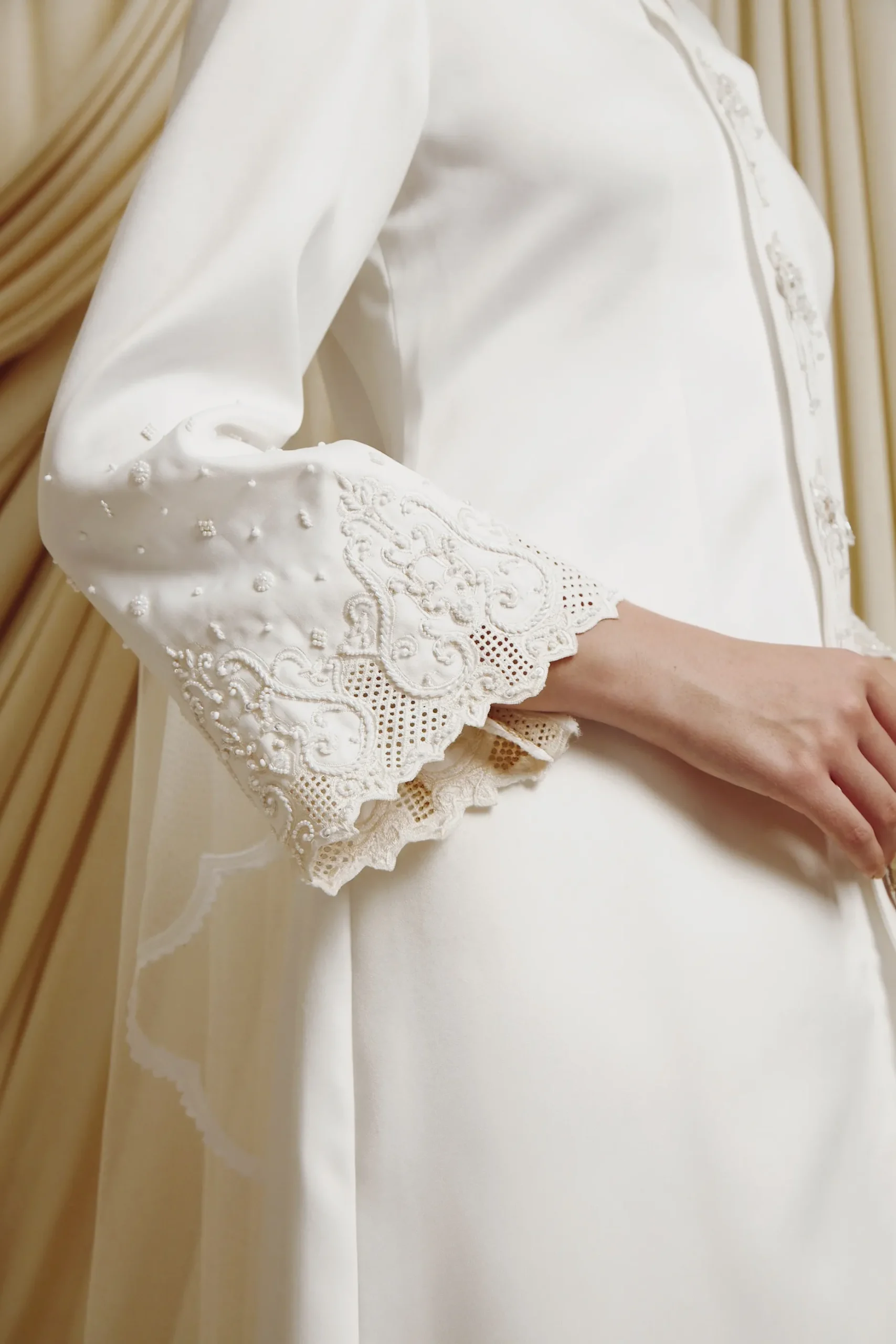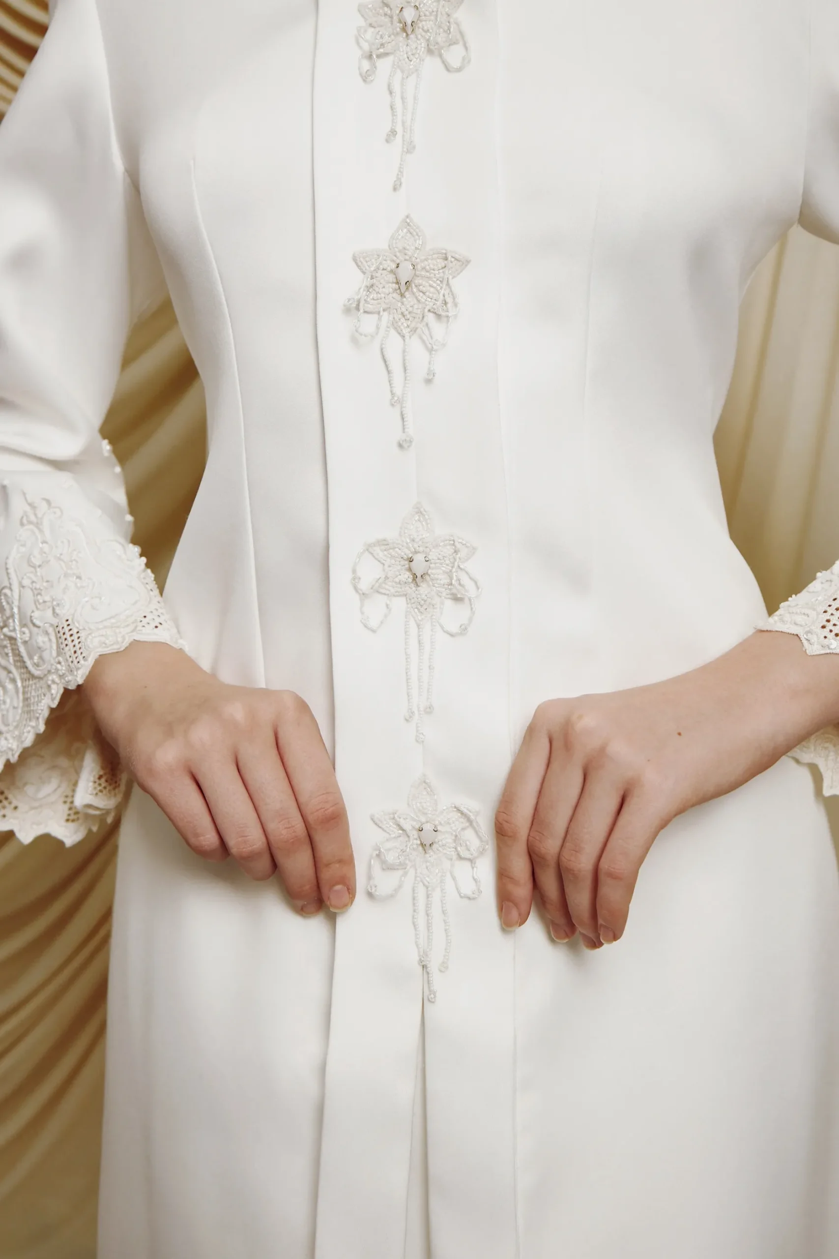 Long Kebaya with flower buttons and embroidery in off white.