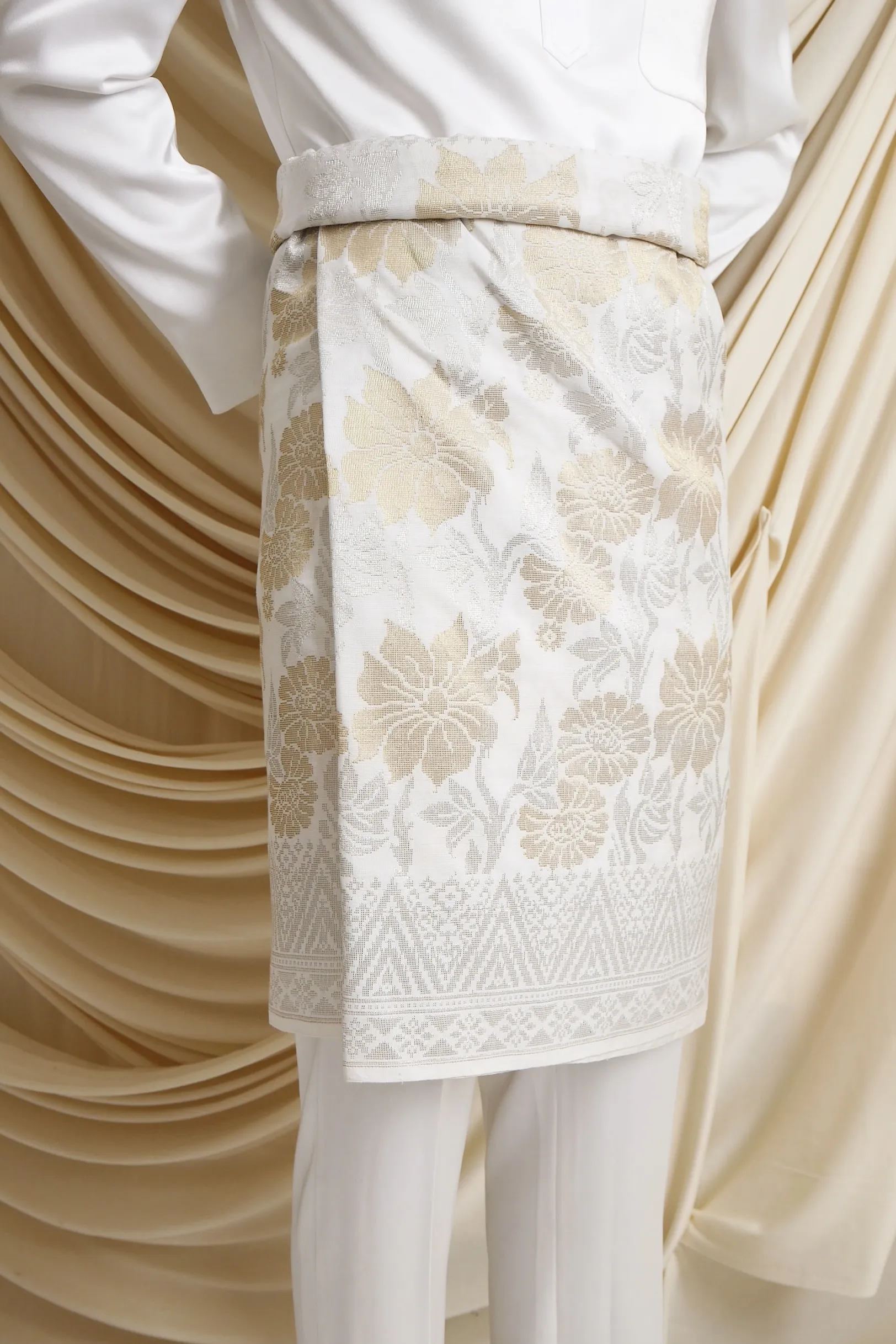 A timeless silver songket, exuding grace and sophistication. Perfect for brides seeking a classic and regal look.
