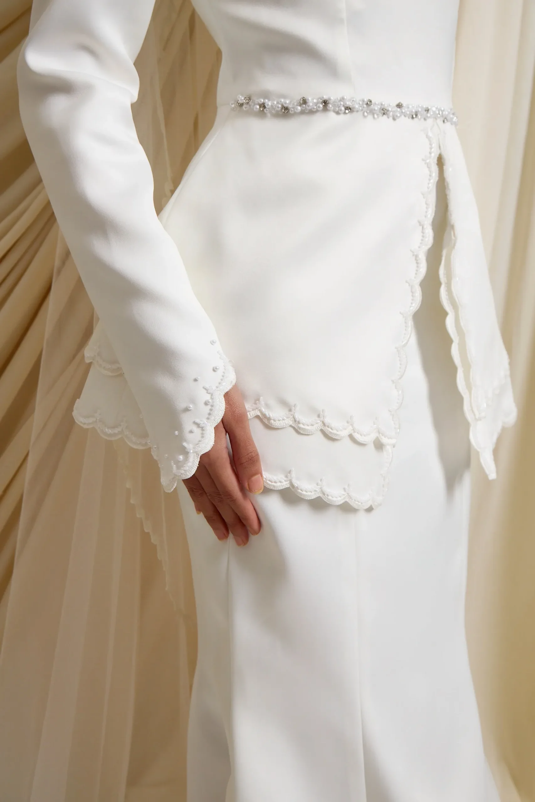 Modern Kurung with beading and embroidery in off white.